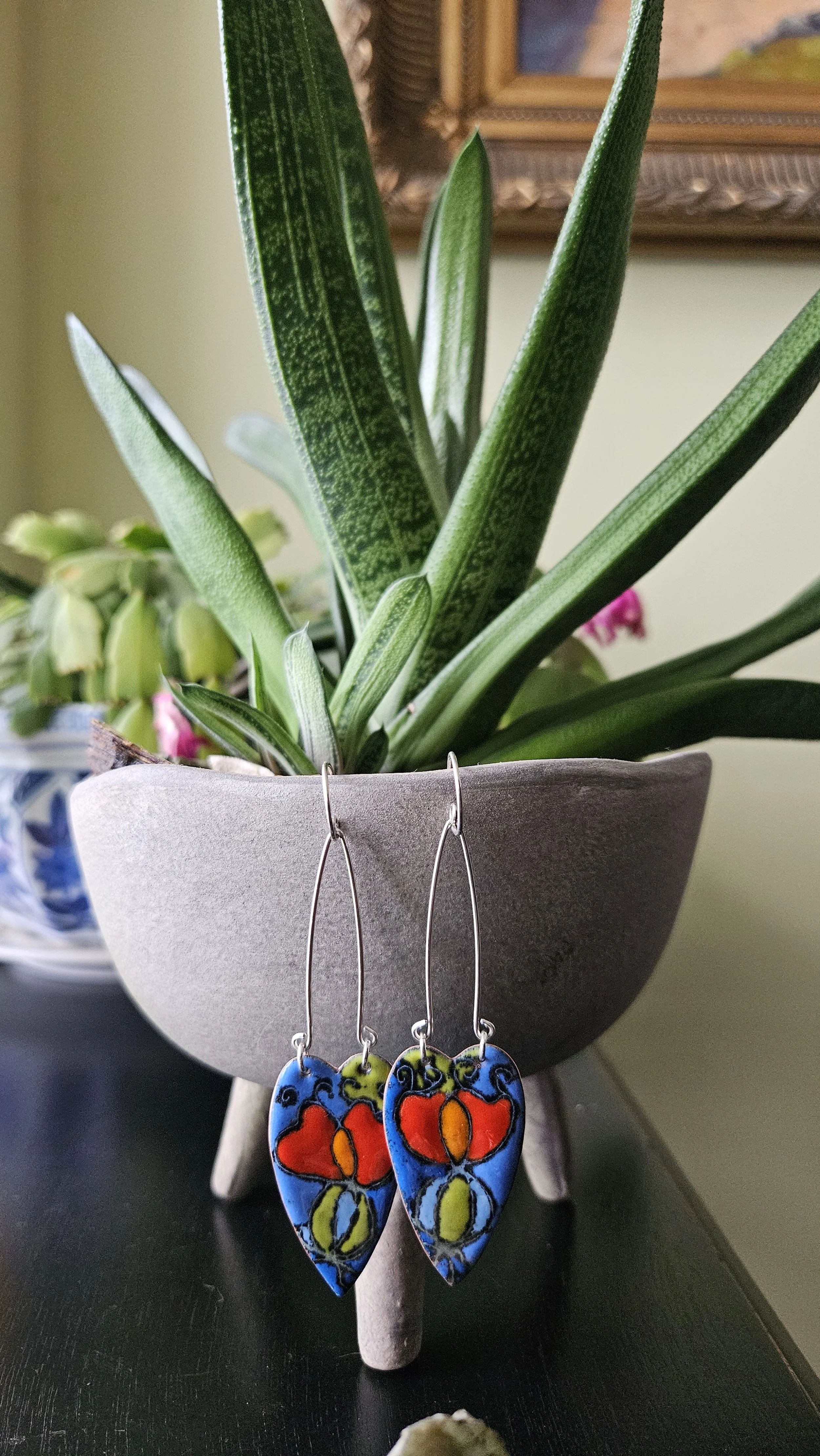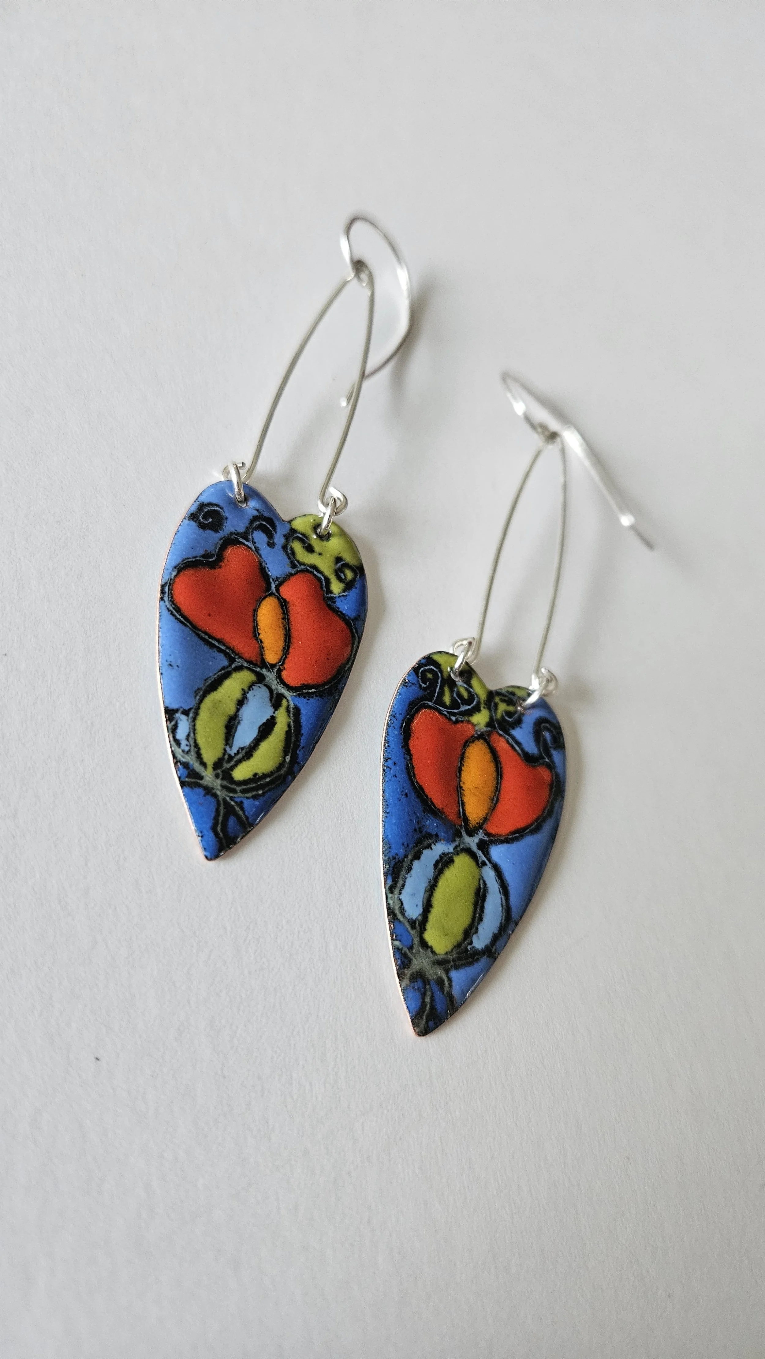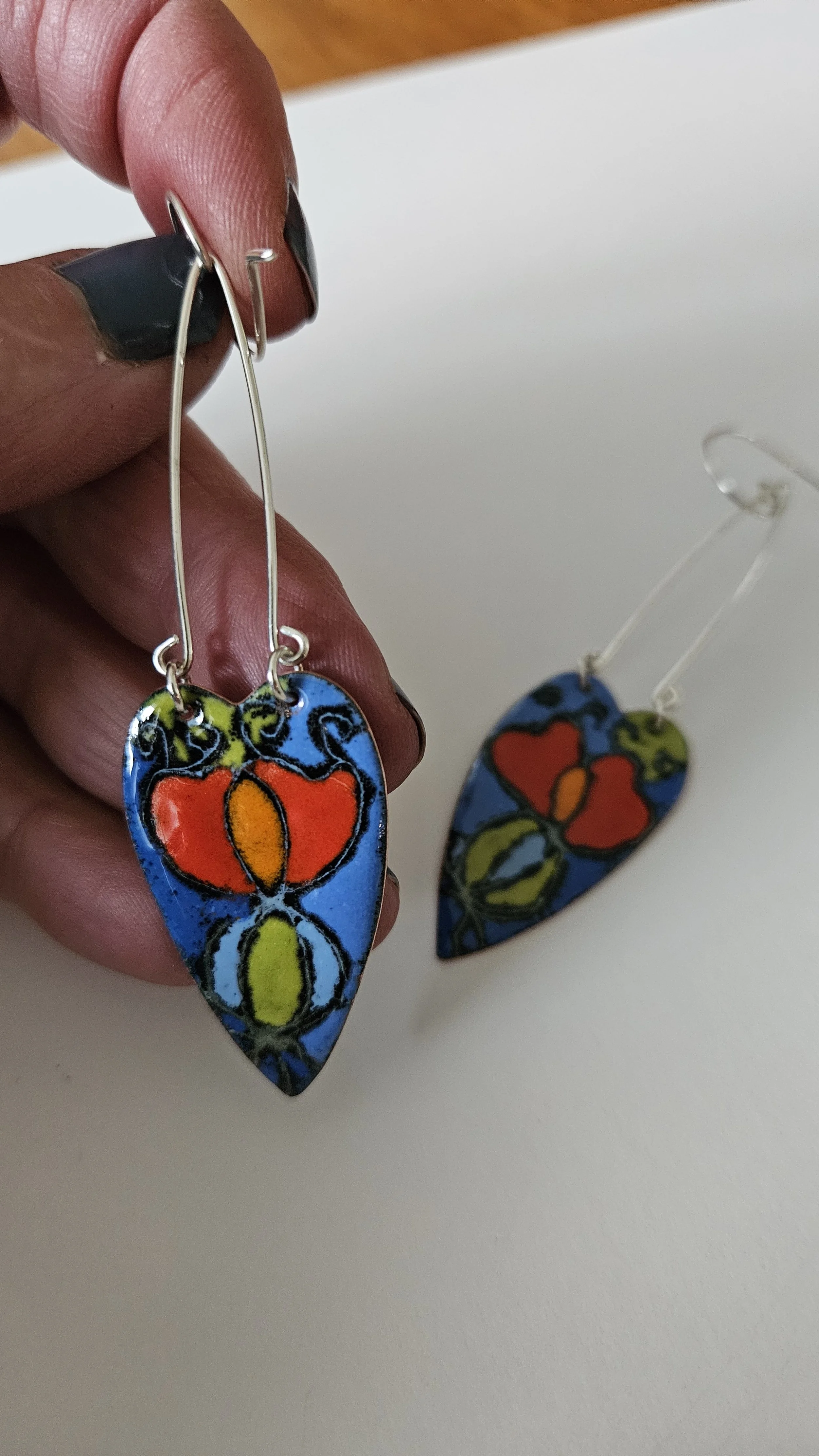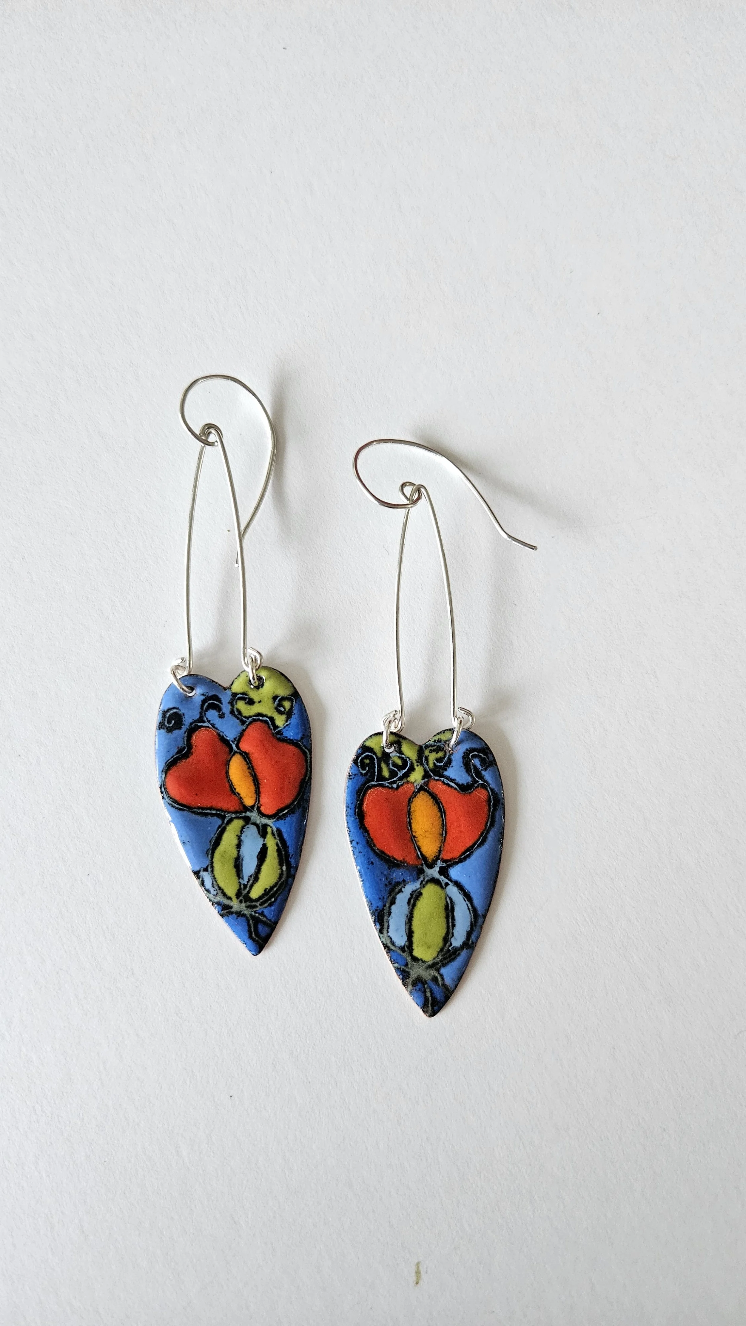 Elegant dangle earrings in bright colors. Long argentium wires suspend the heart shaped enamel piece ending in a delicately curved earwire.