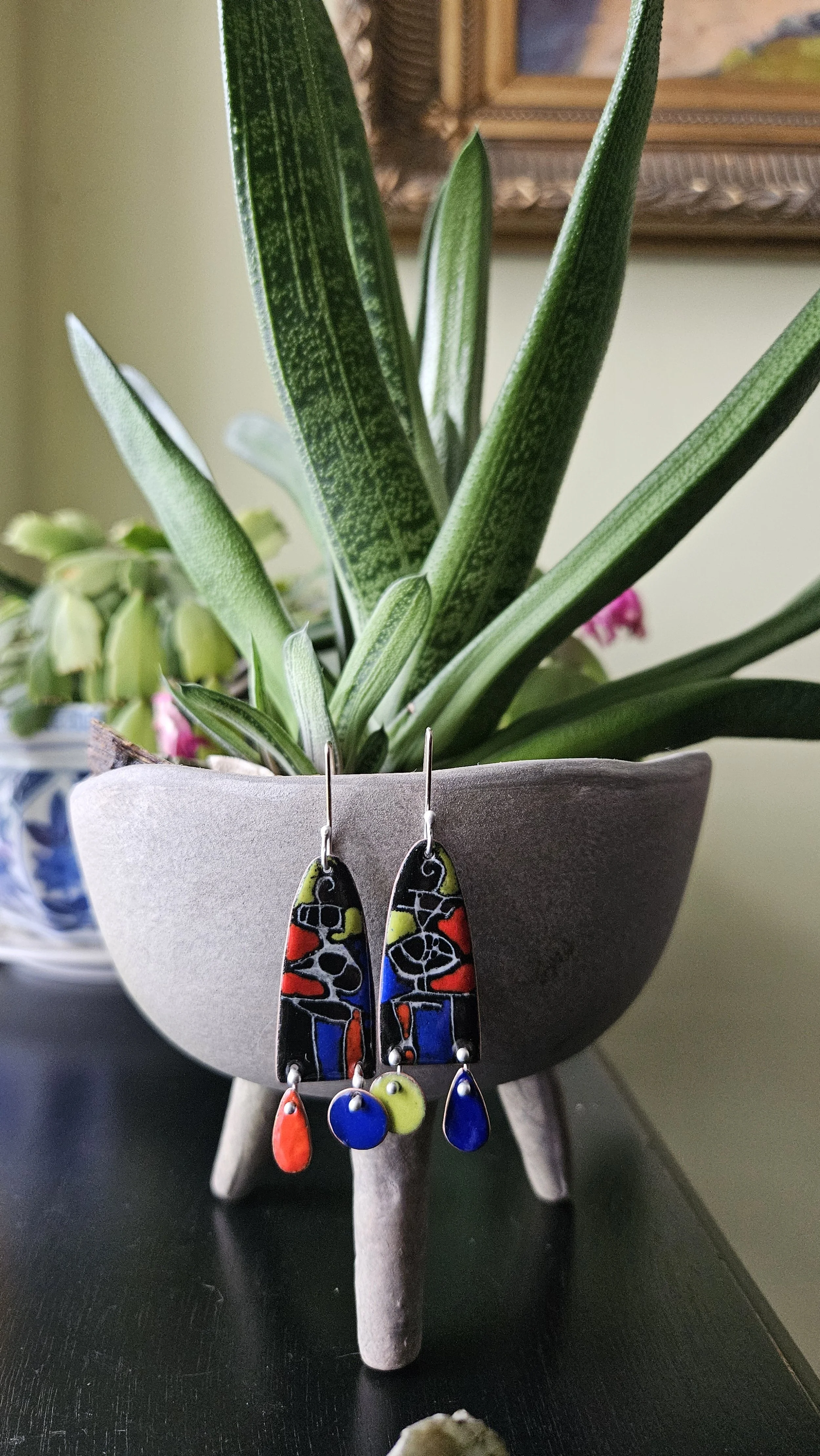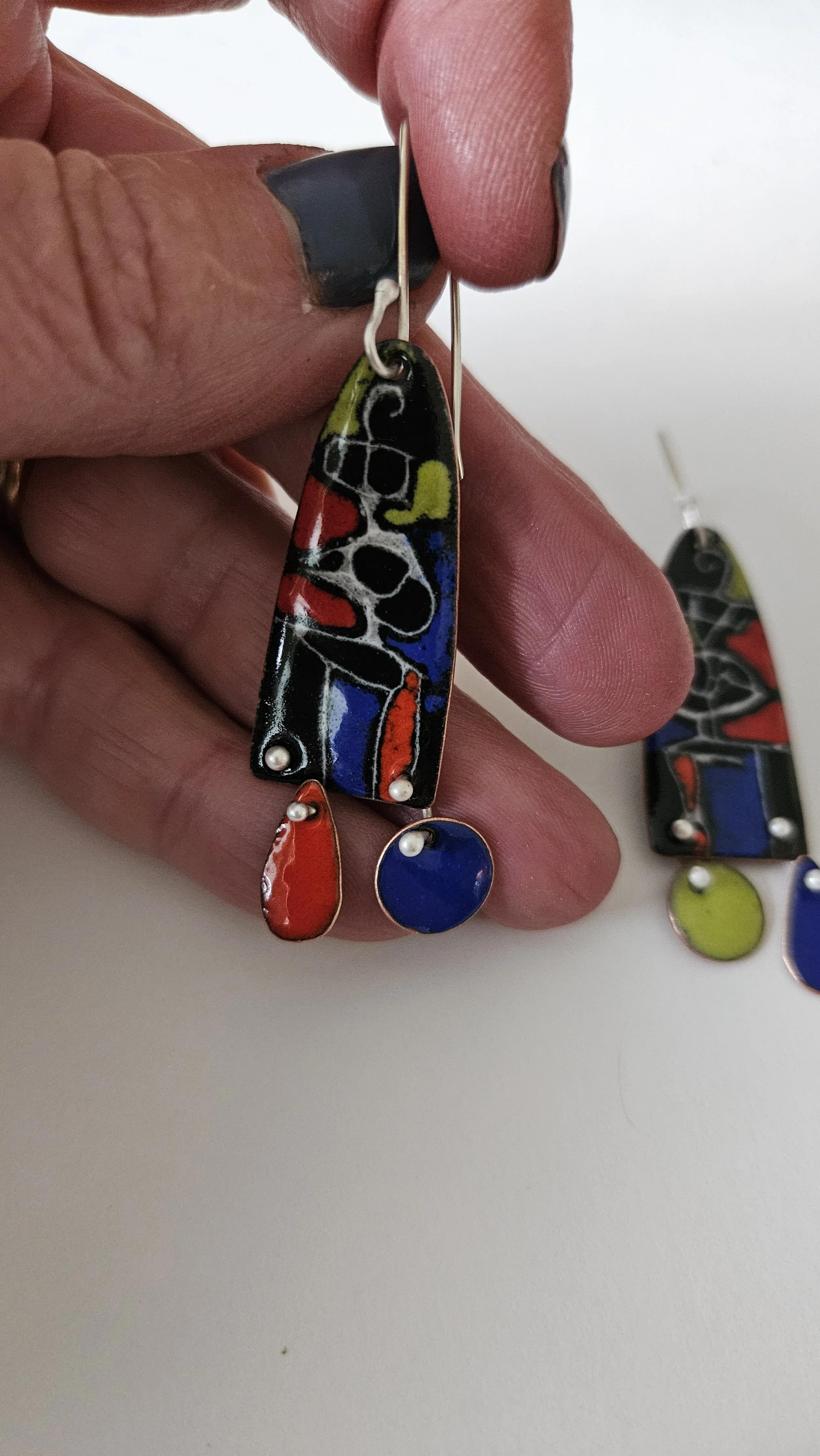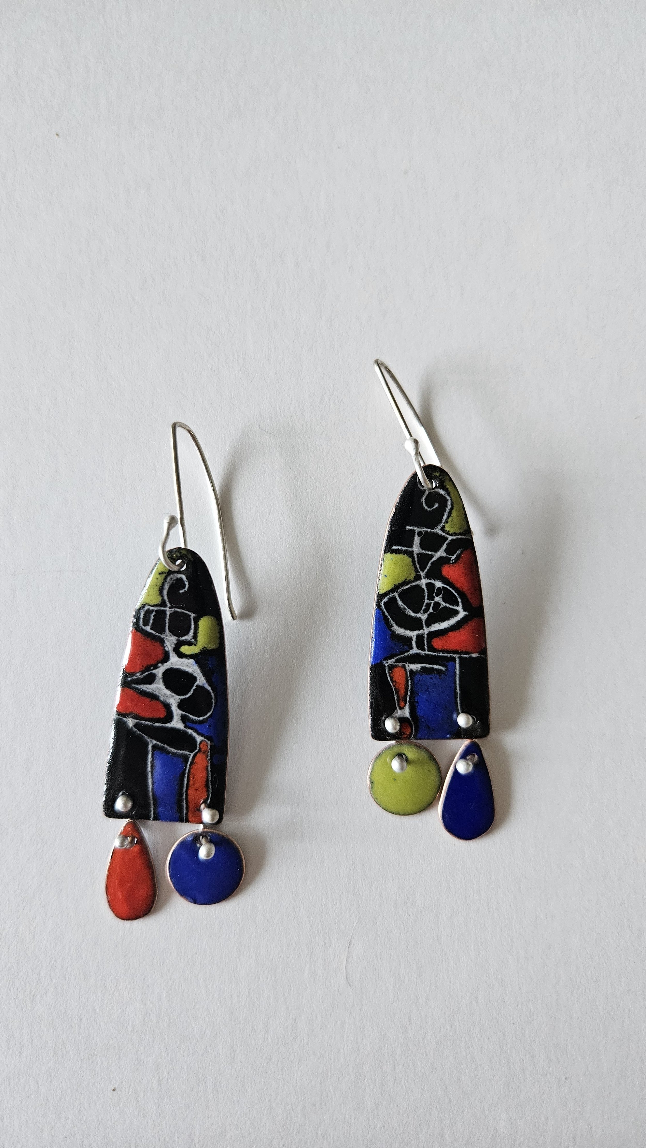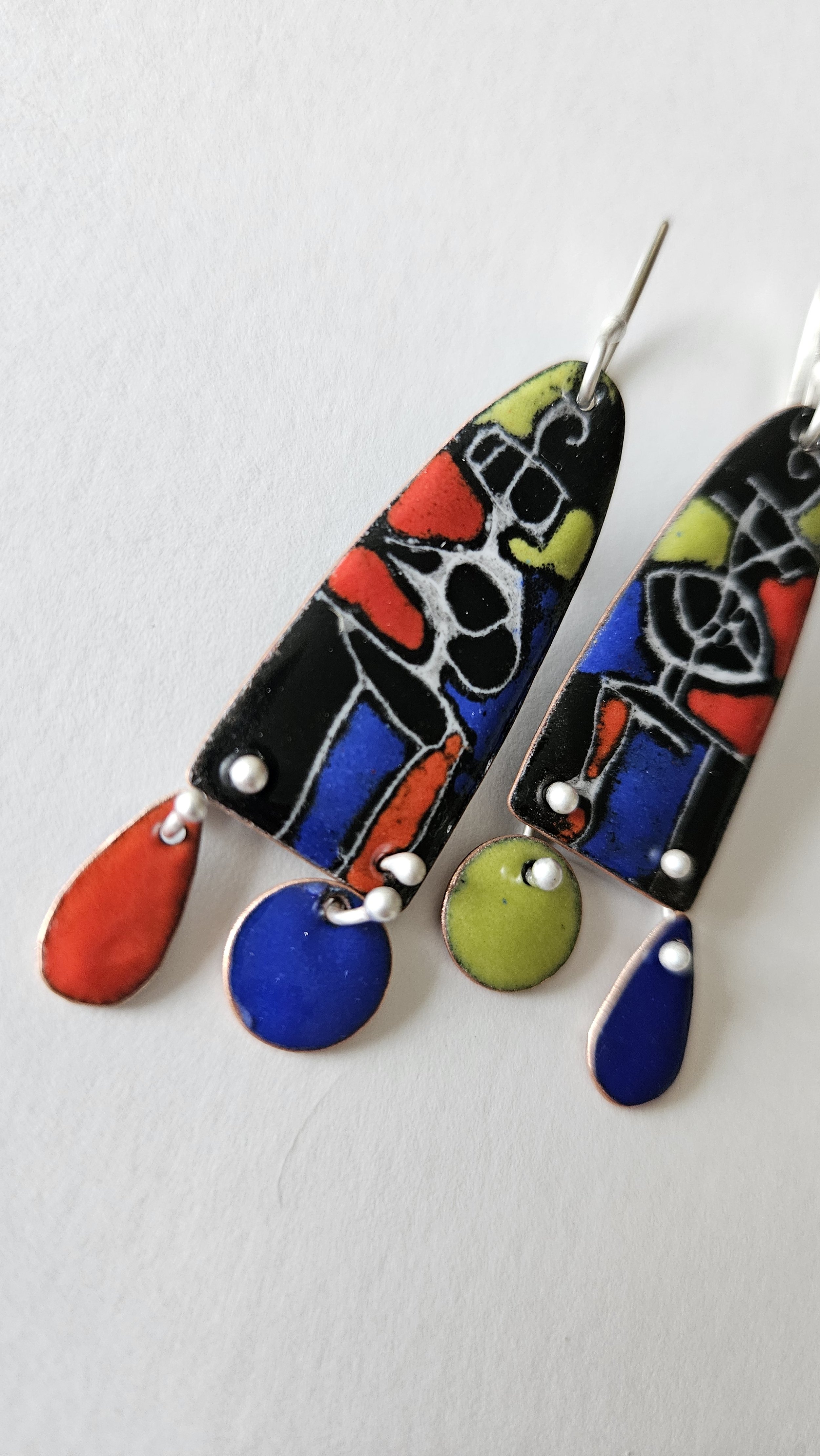 Modern earrings in bright primary colors with fun little details to enliven any outfit.