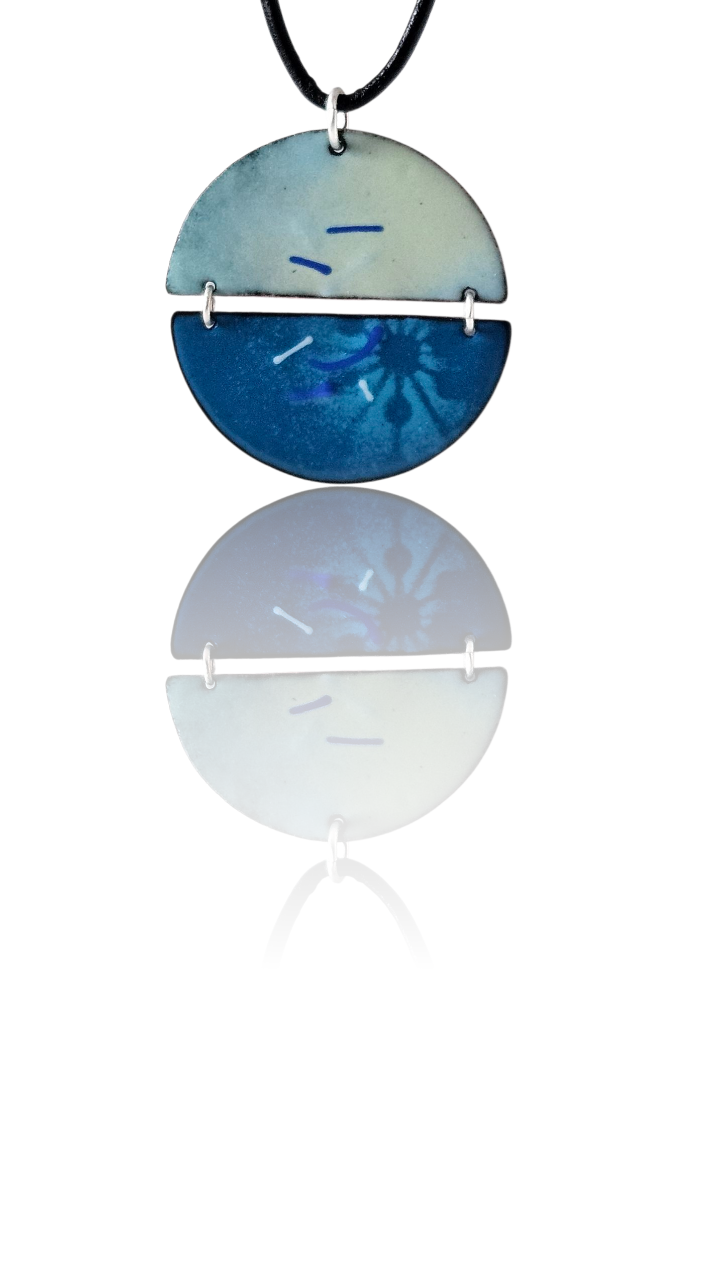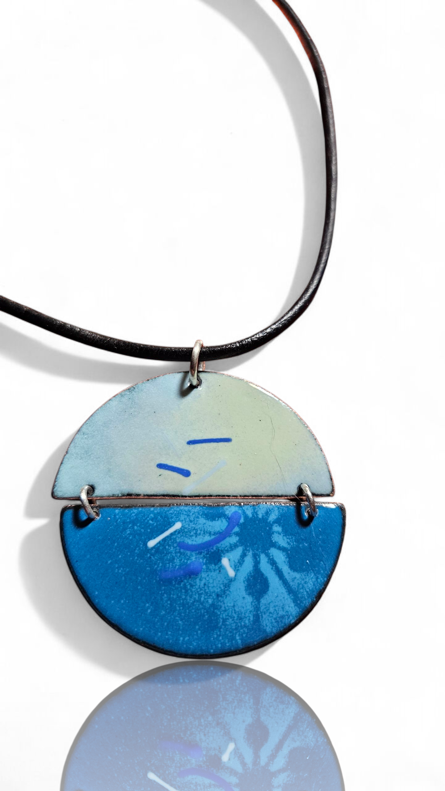 Pendant is 1.5 wide on a leather 18” cord that is adjustable to 20”